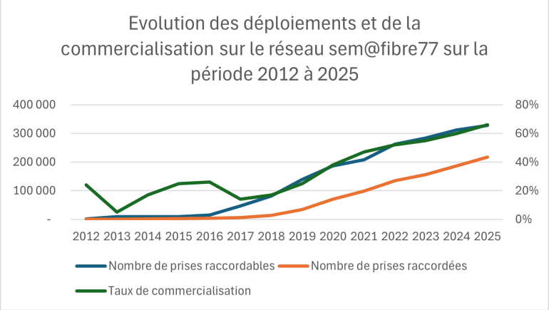 Fin 2025, le réseau comptabilisait 328 000 prises raccordables, parmi lesquelles 217 300 prises étaient raccordées à un abonné, représentant un peu plus de 66 % de taux de commercialisation du réseau sem@fibre77.