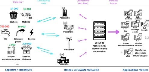 La passerelle jour un double rôle : d'abord, elle sert de concentrateur des données communiquée par l'exemple des objets connectés qu'elle couvre dans son périmètre. Ensuite, grâce à sa connexion à Internet (4G ou filaire), elle transfère les données au cœur de réseau (serveur) afin de stocker et de décoder les données. Le cœur de réseau transmet ensuite, via des connecteurs, les données aux plateformes de visualisation qui sont, soit des plateformes métiers (eau, déchets, énergie, mobilité, sécurité, etc.) ou des hyperviseurs (concentrateurs de plusieurs métiers).