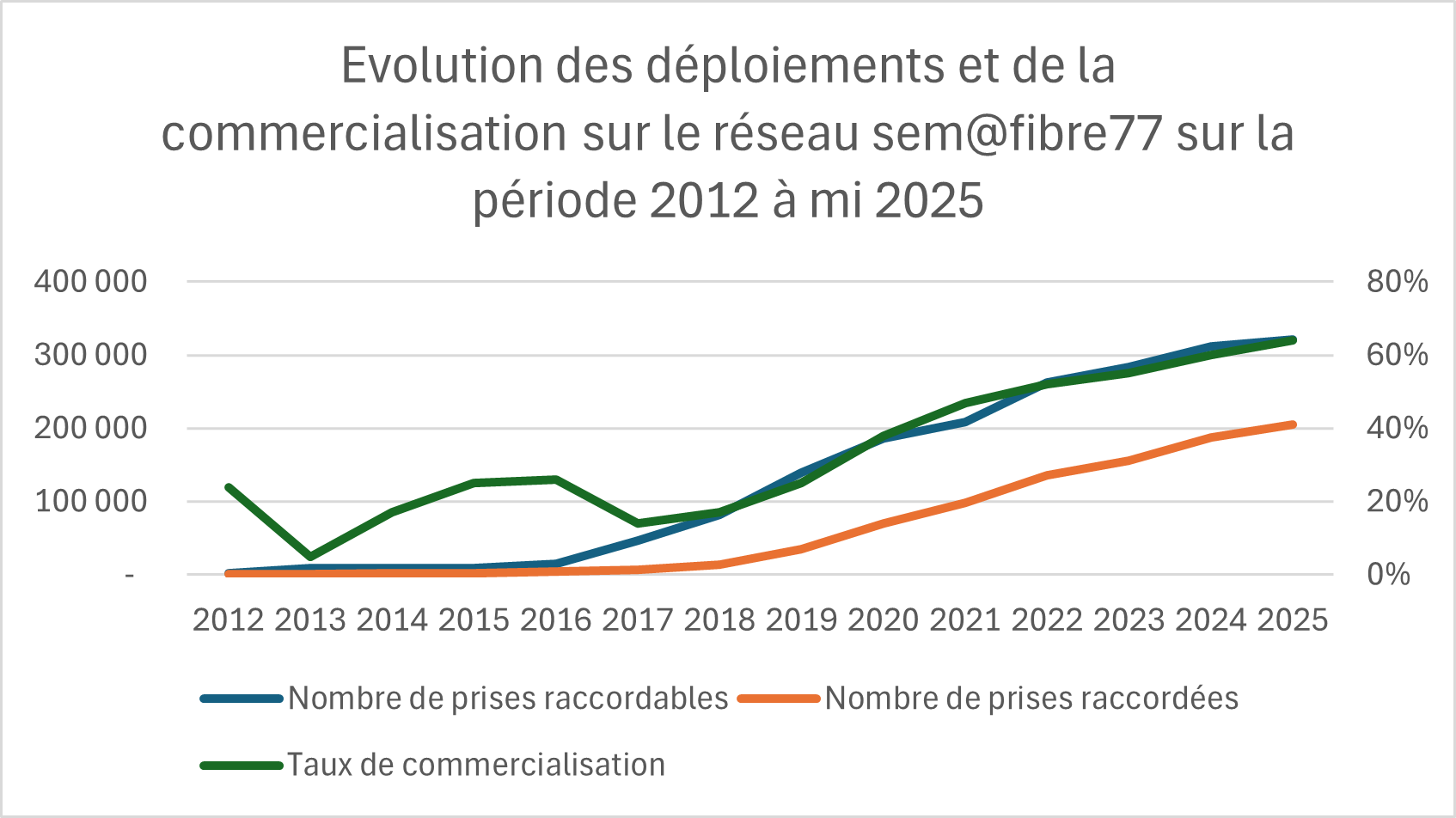 Mi trimestre 2025, le réseau comptabilisait 321 000 prises raccordables, parmi lesquelles 204 000 prises étaient raccordées à un abonné, représentant un peu plus de 64 % de taux de commercialisation du réseau sem@fibre77.