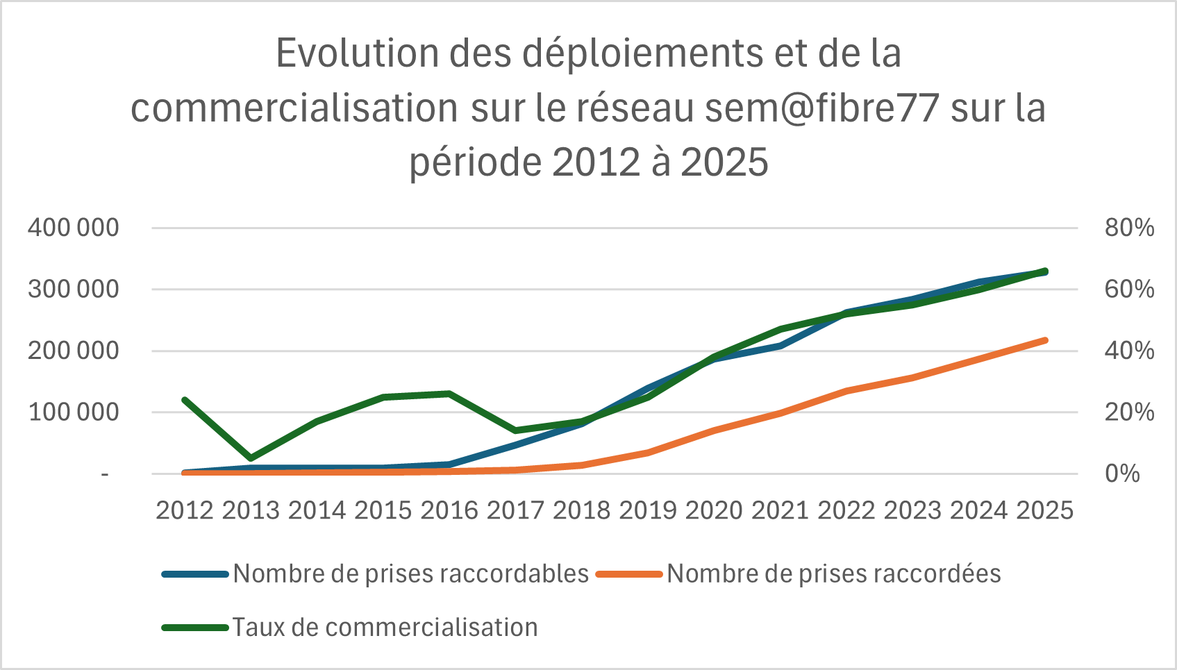 Fin 2025, le réseau comptabilisait 328 000 prises raccordables, parmi lesquelles 217 300 prises étaient raccordées à un abonné, représentant un peu plus de 66 % de taux de commercialisation du réseau sem@fibre77.