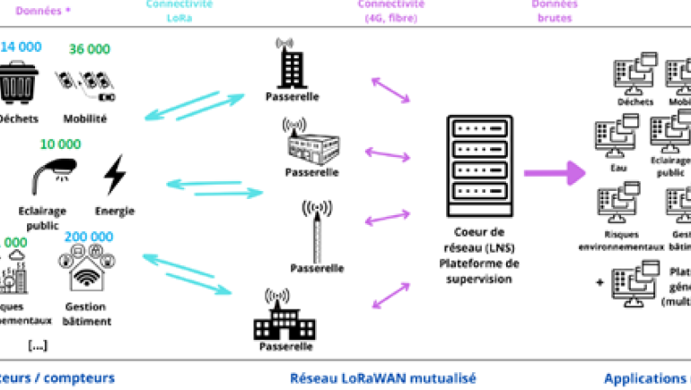Par exemple, des compteurs d'eau connectés LoRa et des capteurs de comptage de personnes LoRa peuvent communiquer avec la même passerelle (relais ou antennes). C'est le principe de mutualisation.